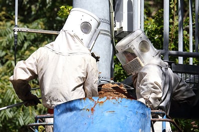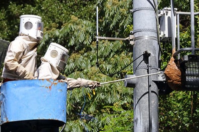 蜂巣除去には防護服や専門機材・業務用薬剤が必要です。