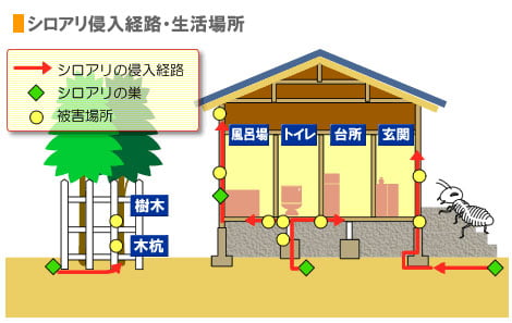 大切な家屋を食いつぶす害虫シロアリ。その実態は建物の床下から蟻道を通って侵入し、大好物の木材・紙類を求めて1年中活動しています。そのため家屋の大切な構造材である土台・大引き・柱を加害します。